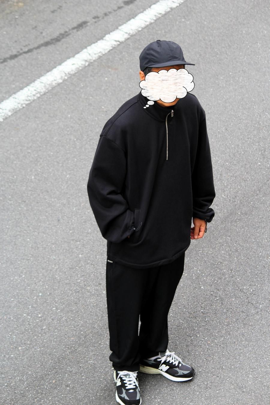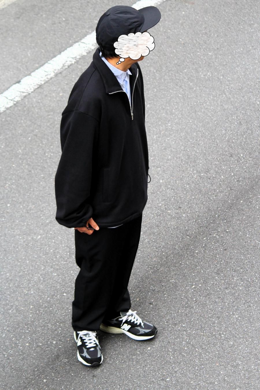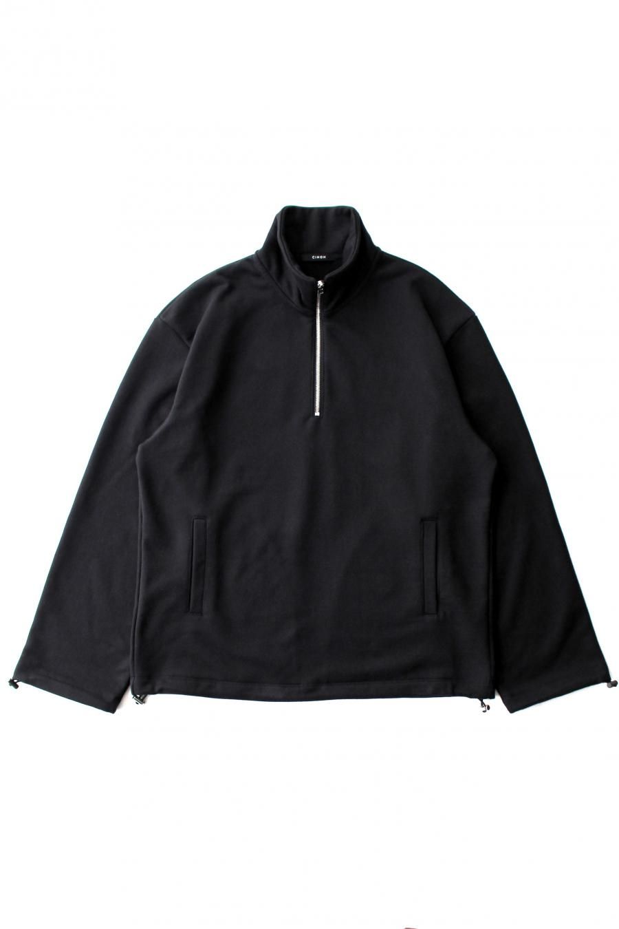 一般的なハーフジップスウェットシャツに比べジップの開きが深いことや、裾と袖口にドローコードが装備されていることなどにより、「フード無しのスウェットアノラック」といった印象。