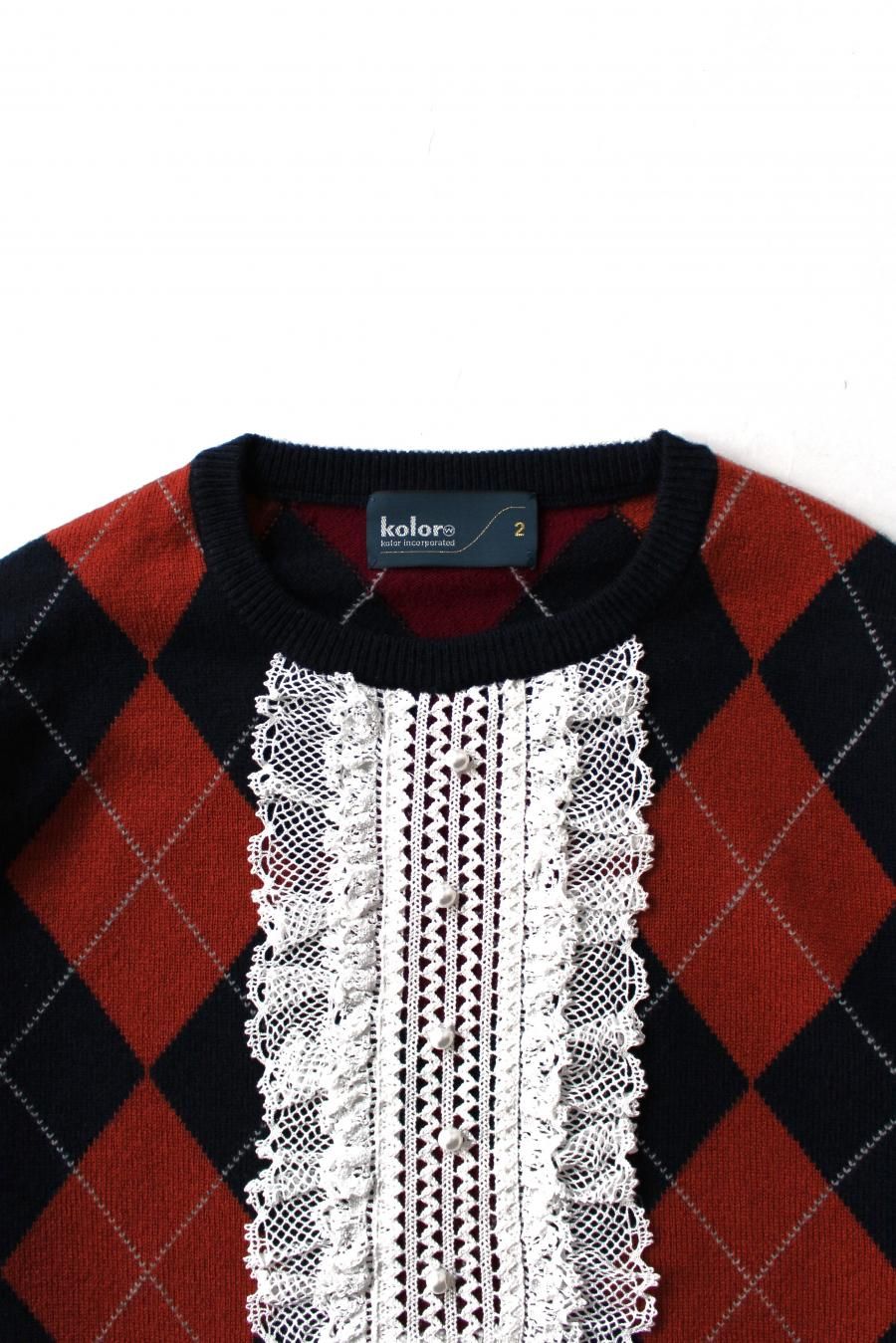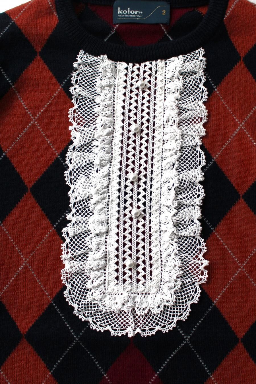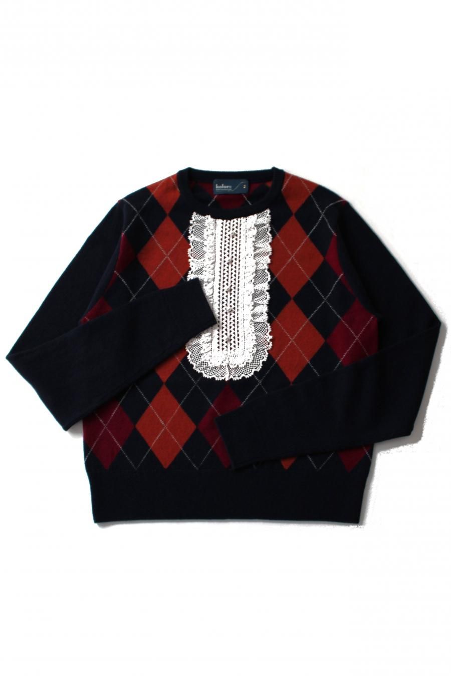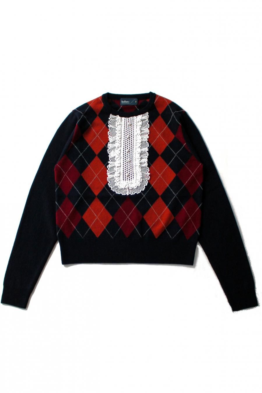 アーガイル模様のクルーネックニットのフロントに、レースのブザム(胸飾り)をオン。