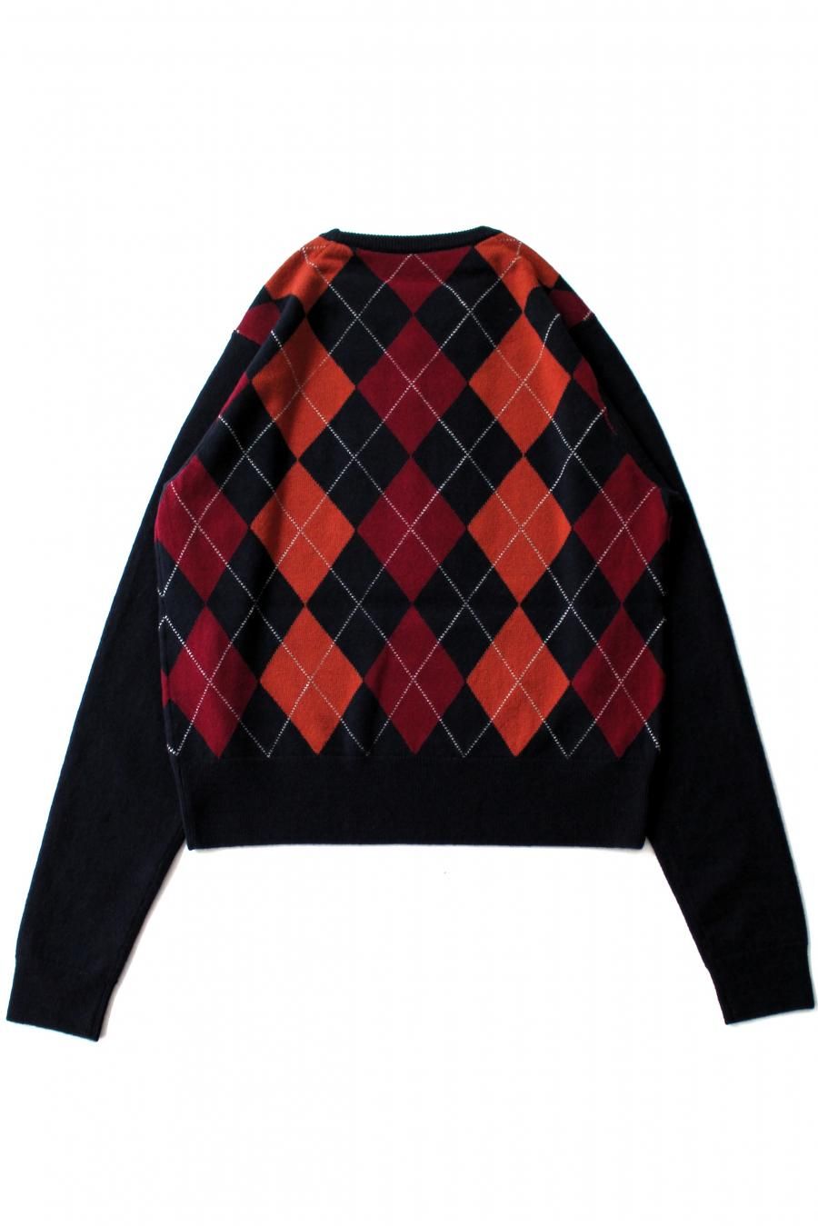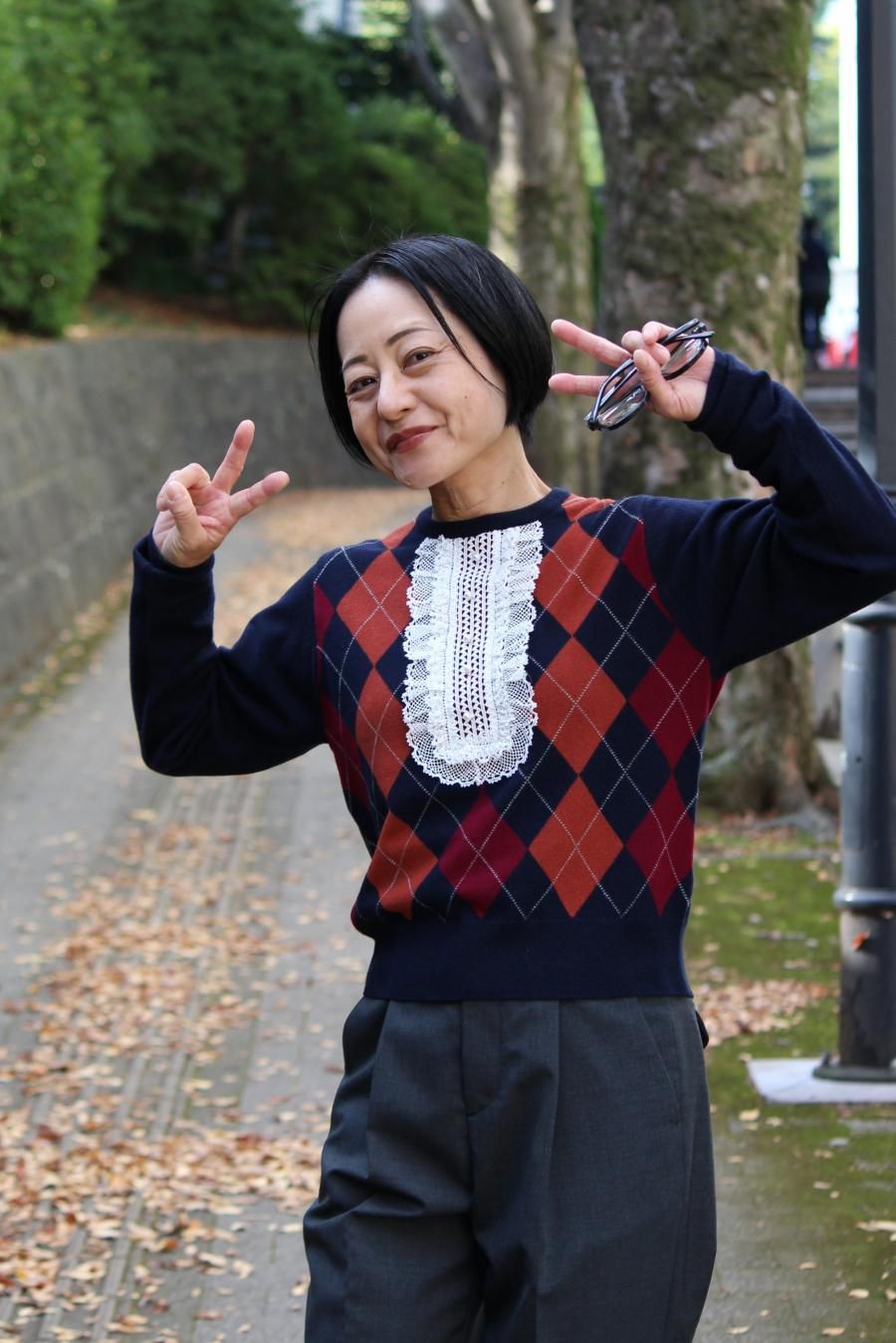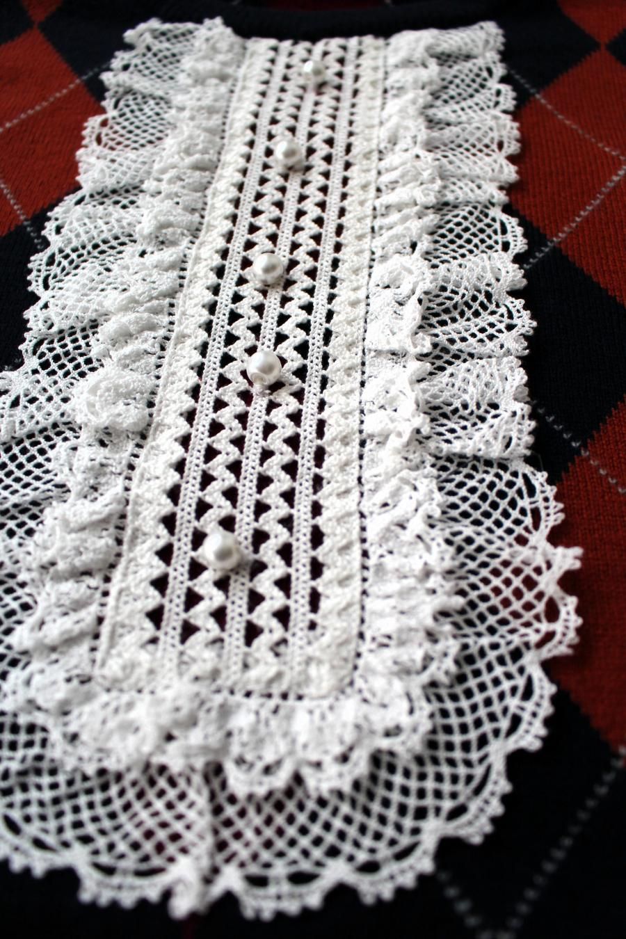 アーガイル模様のクルーネックニットのフロントに、レースのブザム(胸飾り)をオン。