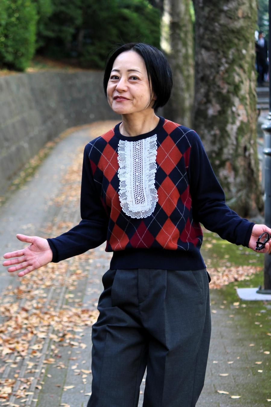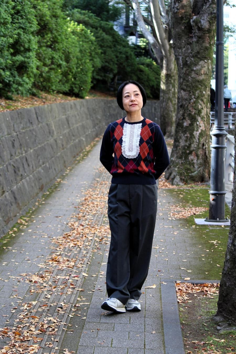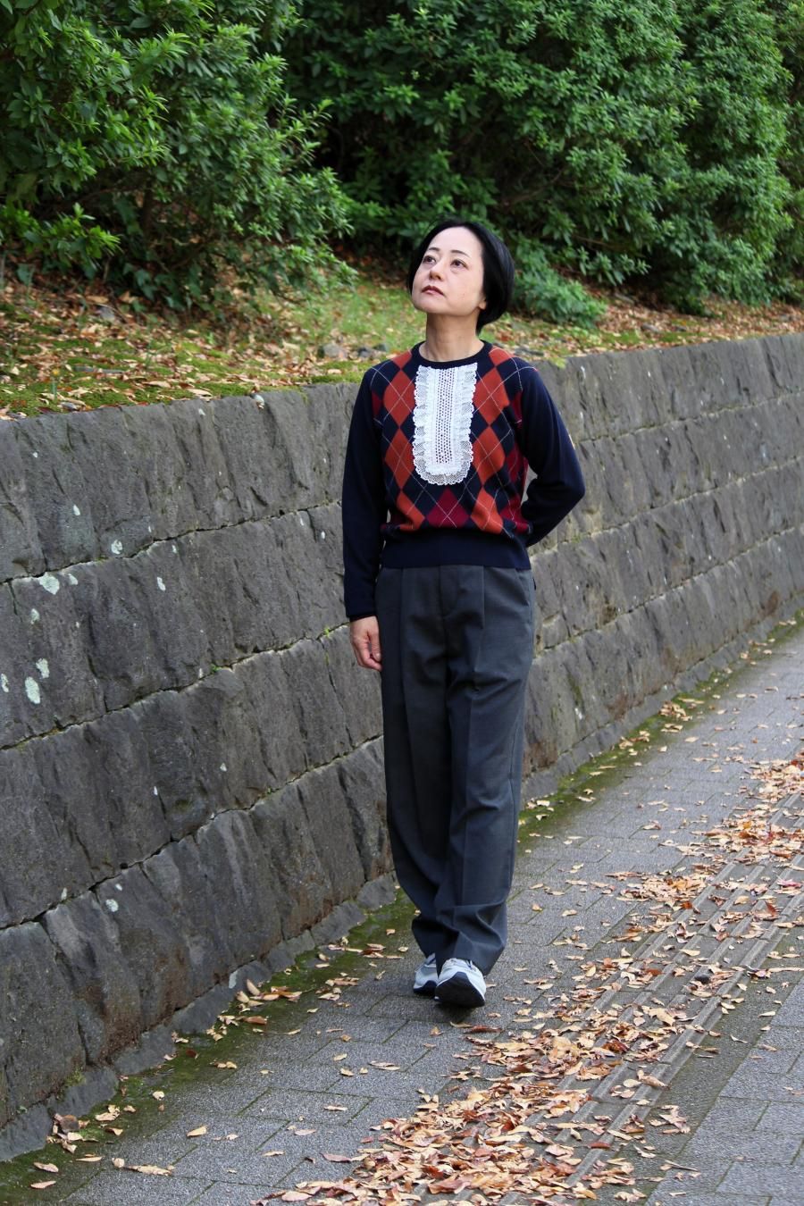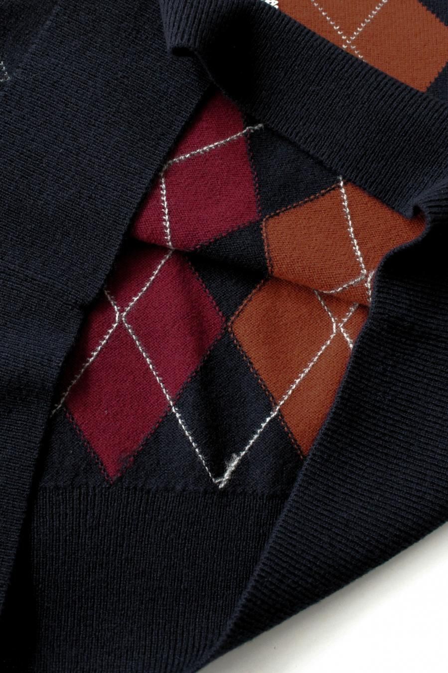 アーガイル模様のクルーネックニットのフロントに、レースのブザム(胸飾り)をオン。