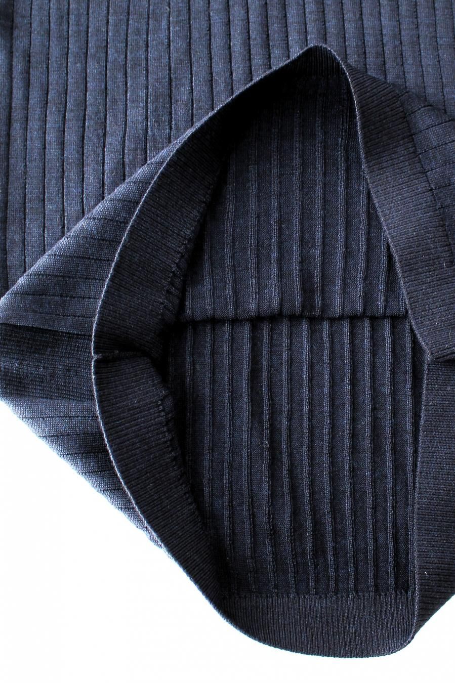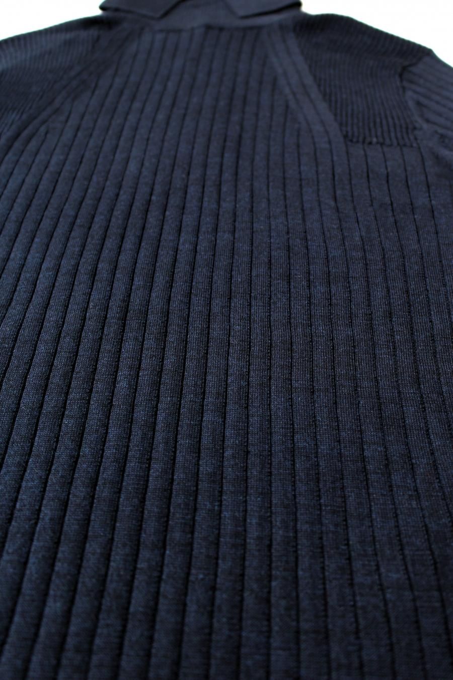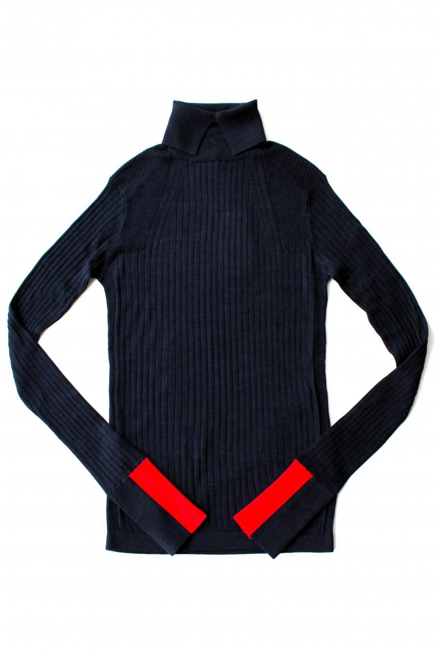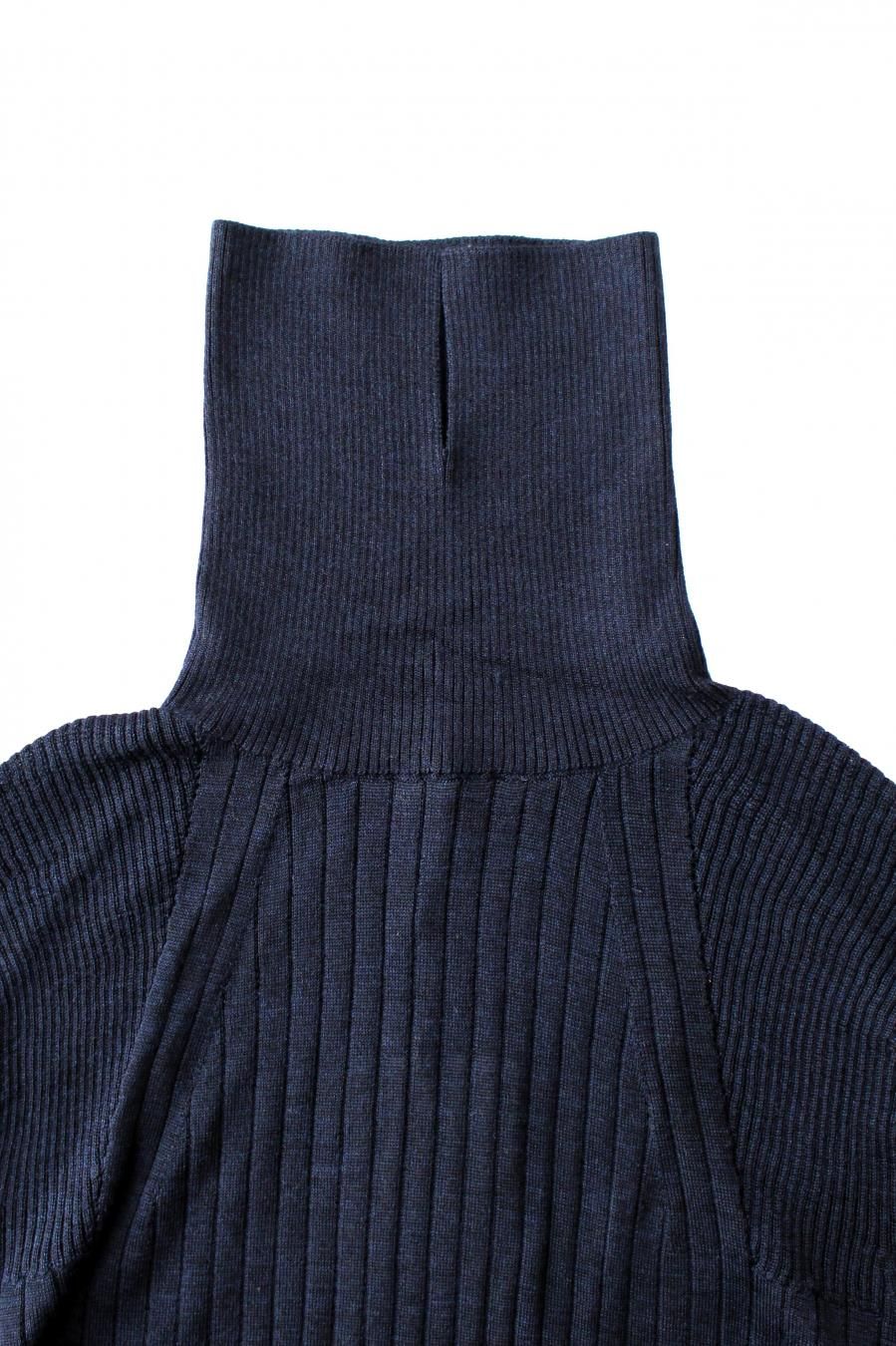 スリットが入ったタートルネックを折り返して、襟のあるタートルのように仕上げたタイトなリブニット。
