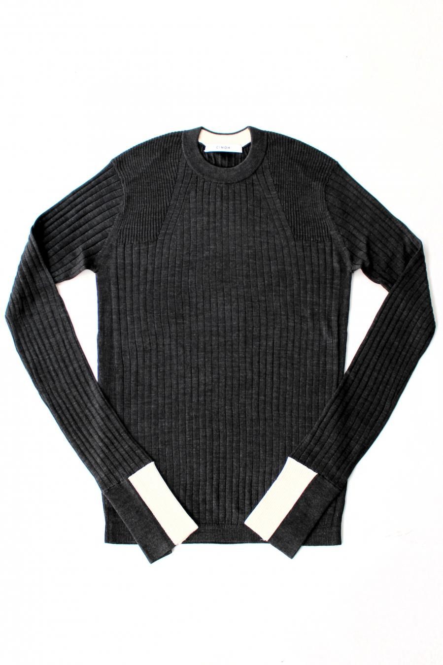 克己的な印象を与えるシャープな襟ぐりが特徴のクルーネックのタイトリブニット。