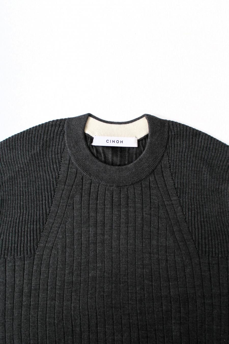 肩部分のリブの方向を切り替えることで、ラグランのような柔らかさと、襟元をすっきりと見せる効果が加わっています。