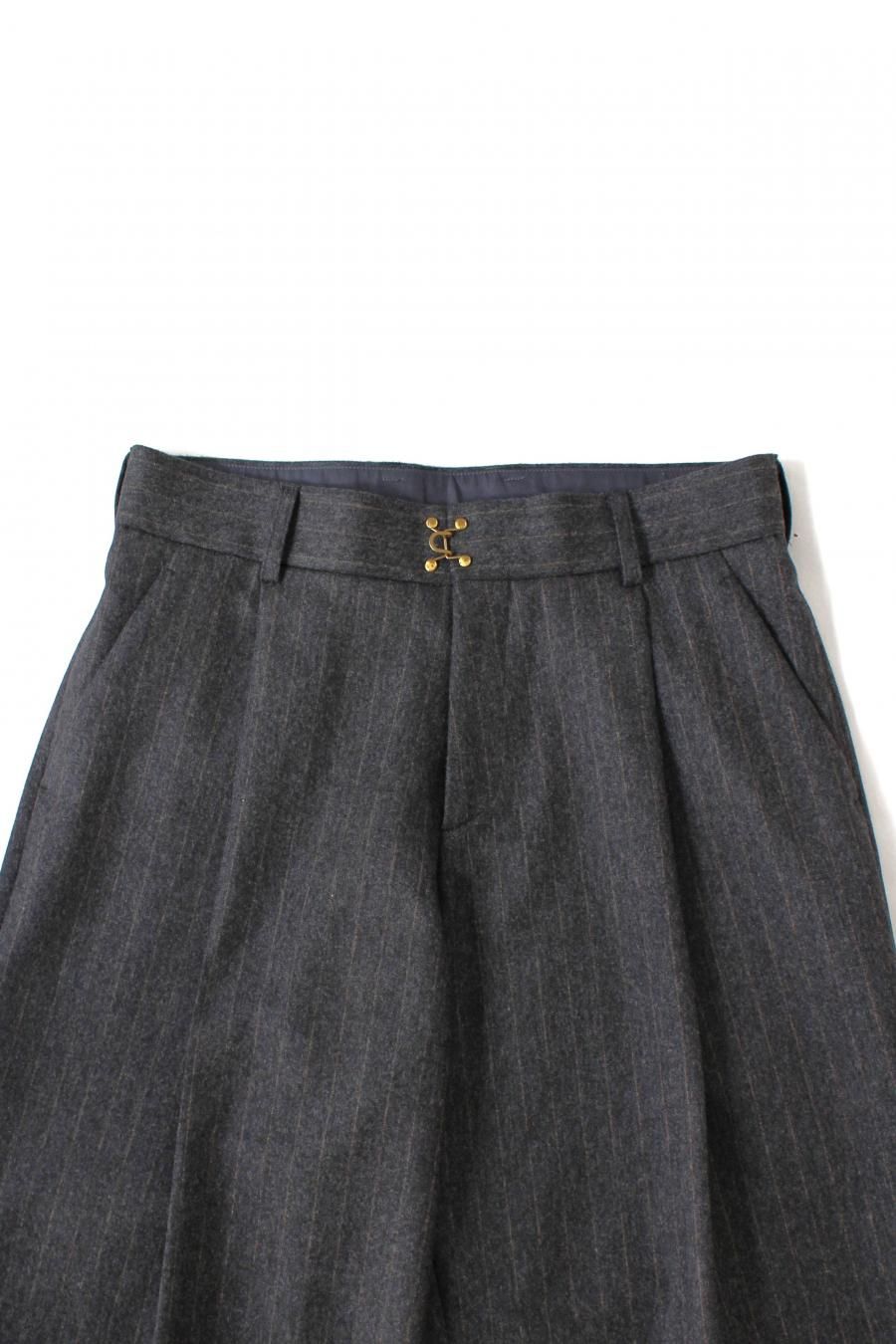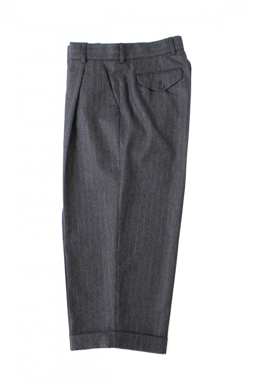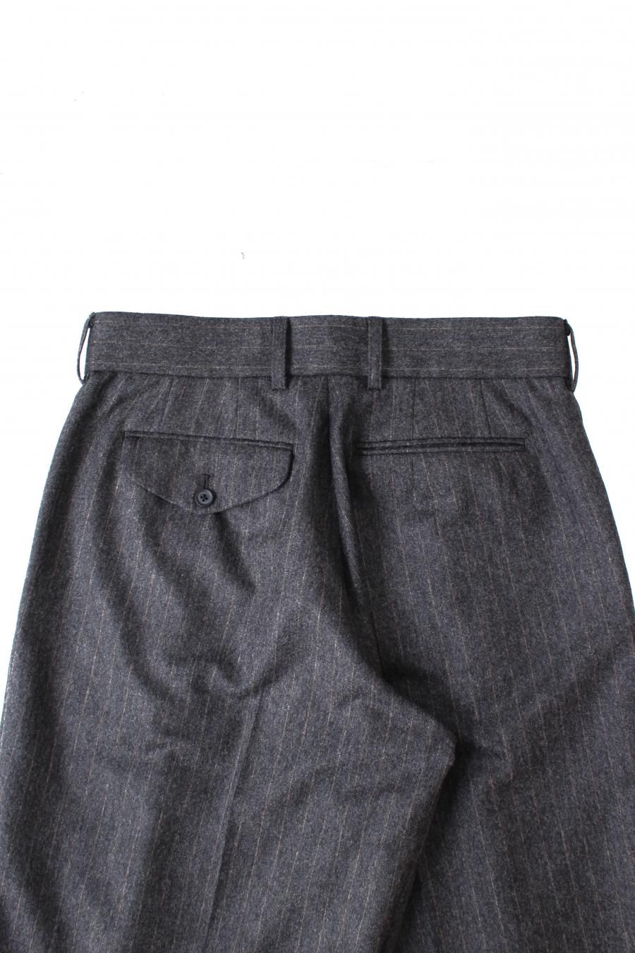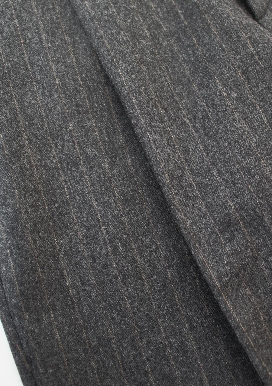 ウールフランネルのピンストライプ生地を用いたワイドスラックス。