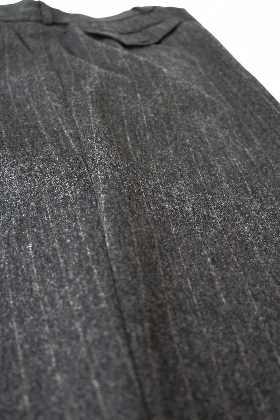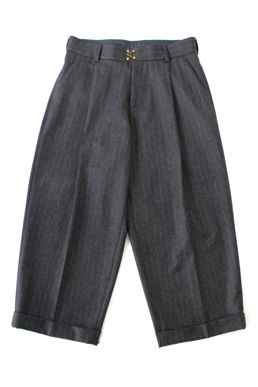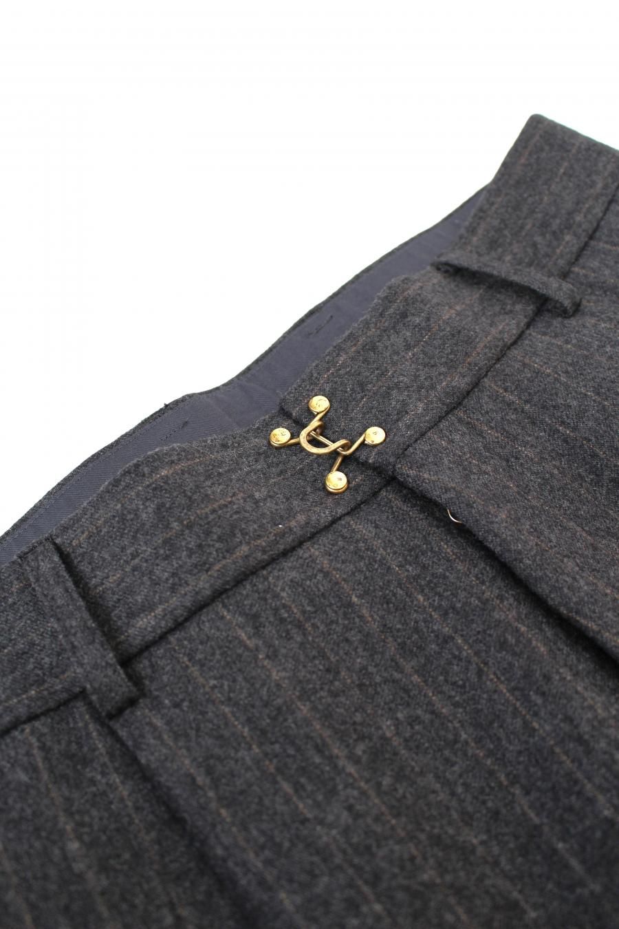 ウールフランネルのピンストライプ生地を用いたワイドスラックス。