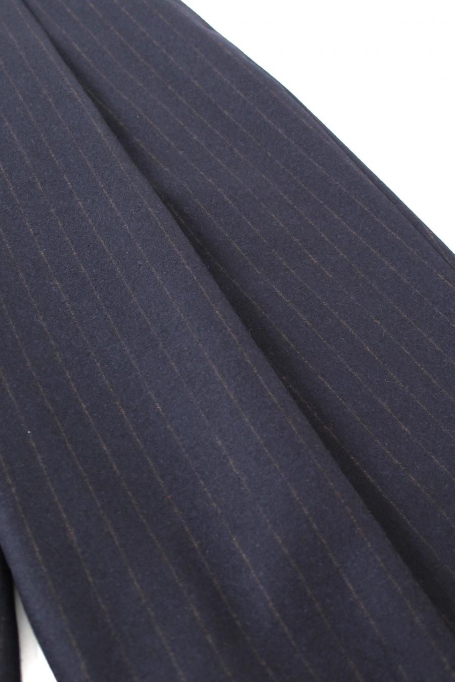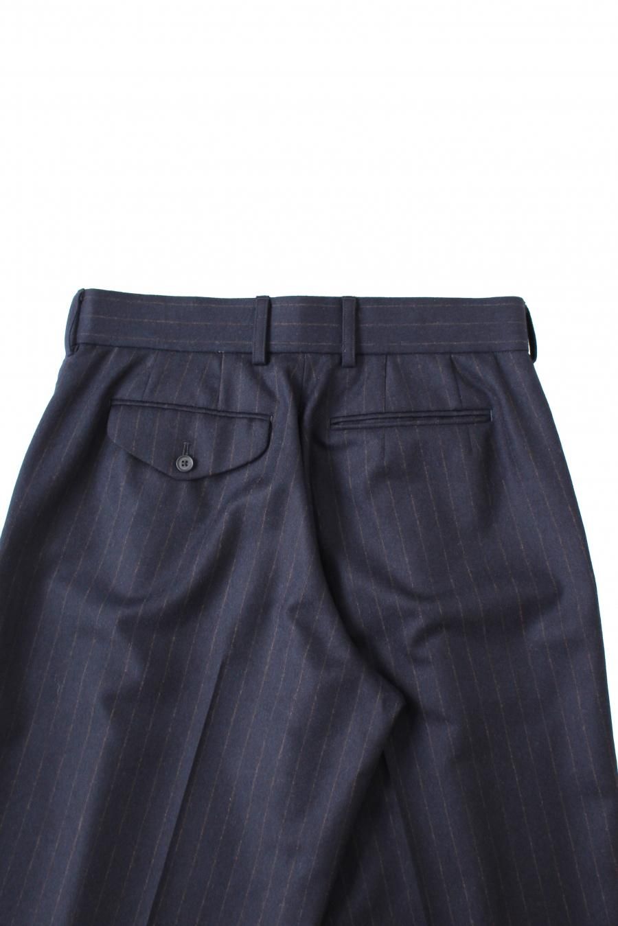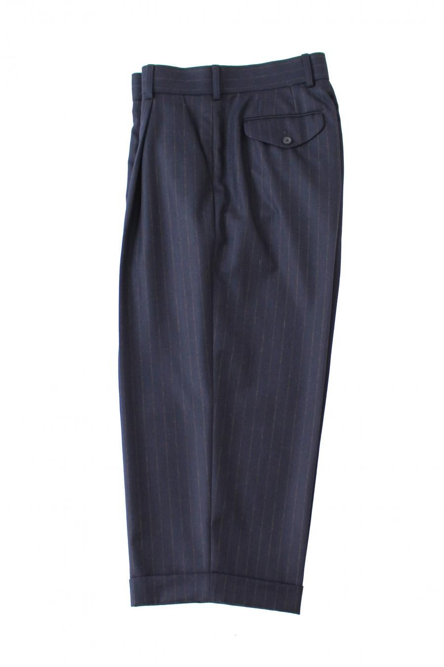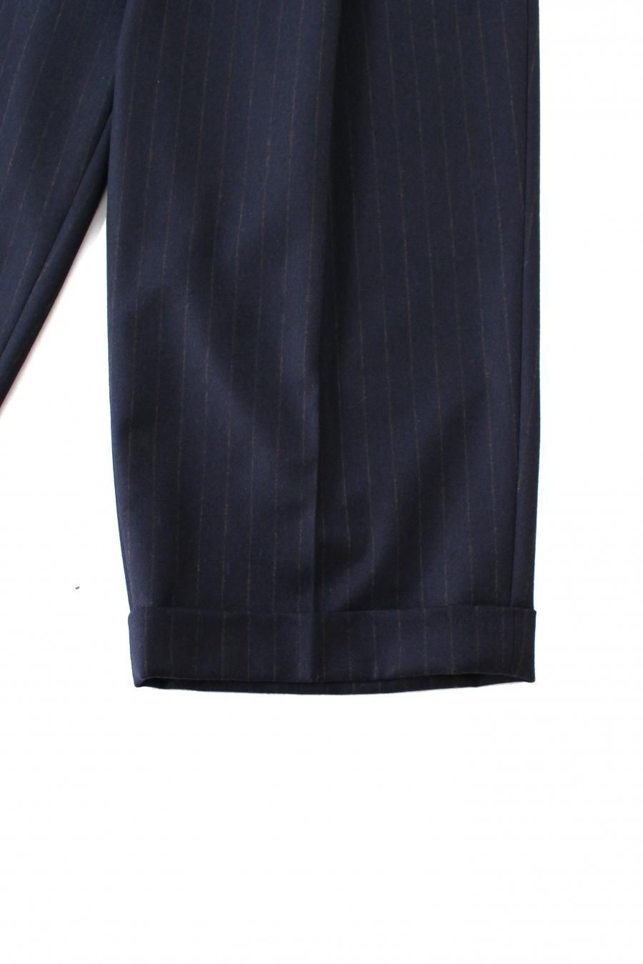 ウールフランネルのピンストライプ生地を用いたワイドスラックス。