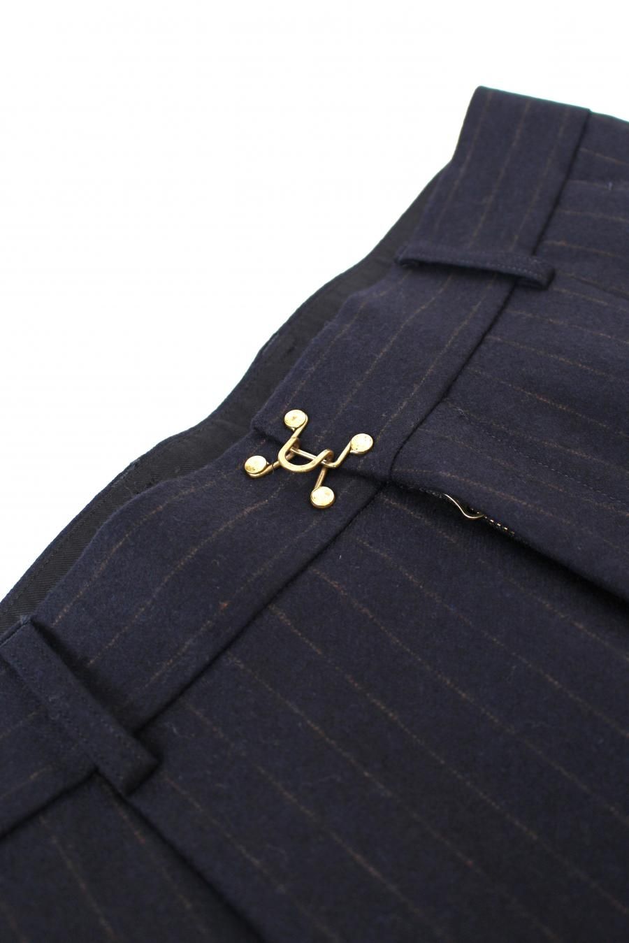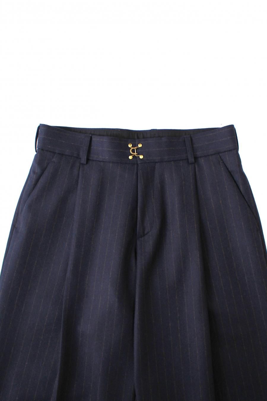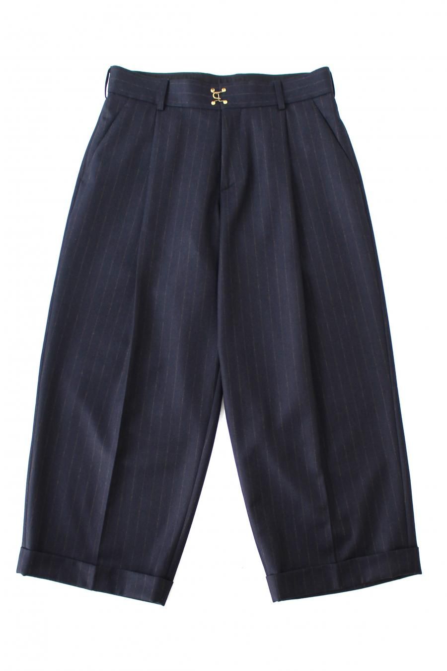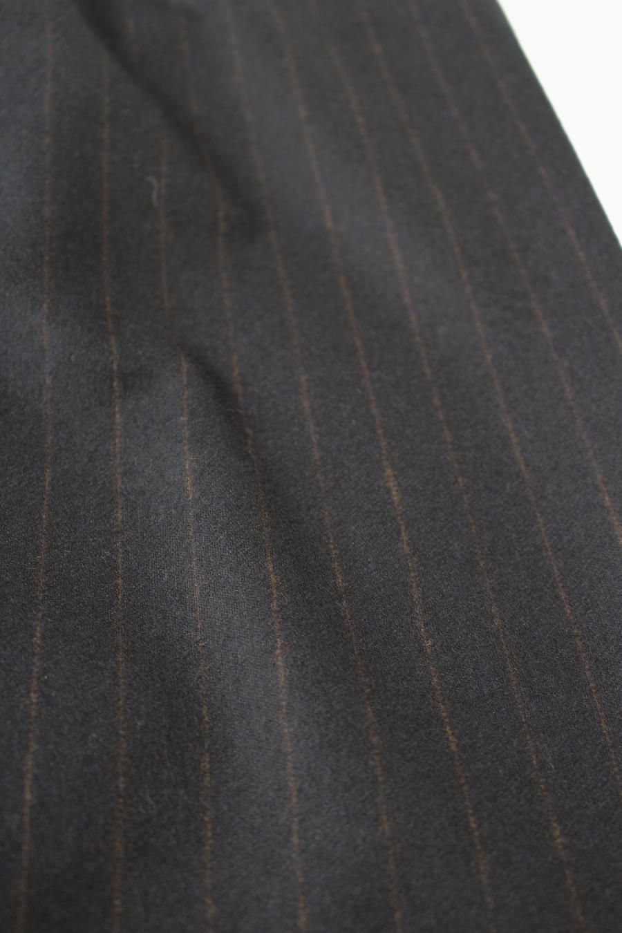 ウールフランネルのピンストライプ生地を用いたワイドスラックス。
